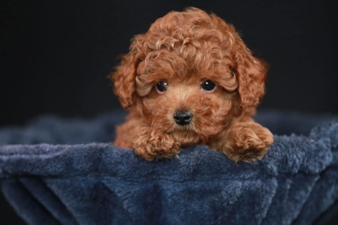Der Vater ist ein kompakter dunkeloranger Teacup-Pudel, ca. 30 cm groß und etwa 6 kg schwer.