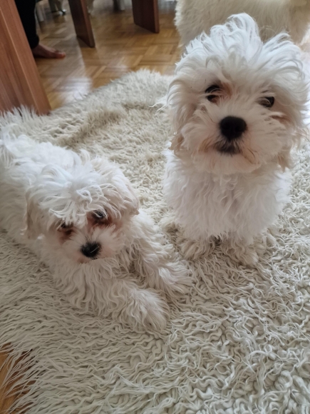 Die Mama ist 2 Jahre alt und Papa ist 4 Jahre alte.sie sind sehr energievoll und verspielt. Sie gehen gerne raus, und lieben es mit Gegenständen zu spielen. Bälle, Seile, Leine alles mögliche. Sie sind weiß und etwas beige /grau gefleckt. Lilly hat am Kopf einen grauen Fleck, wobei Luna am Rücken einen beigen hat.